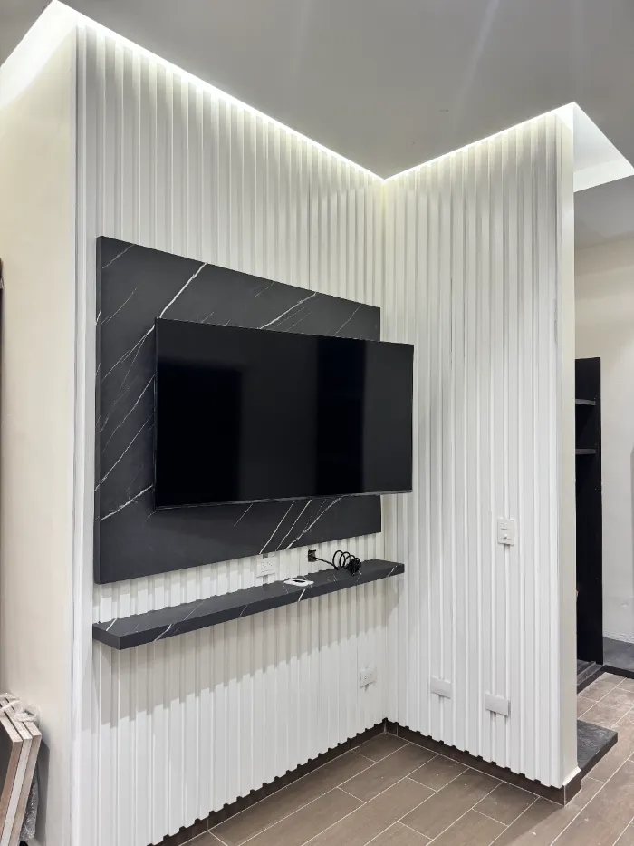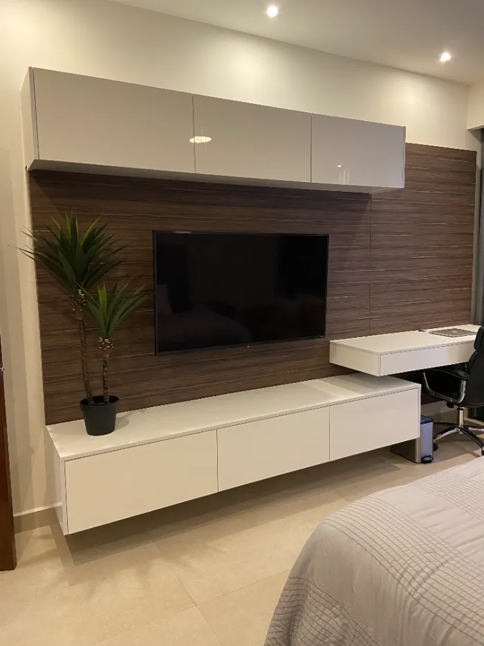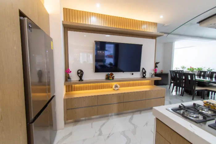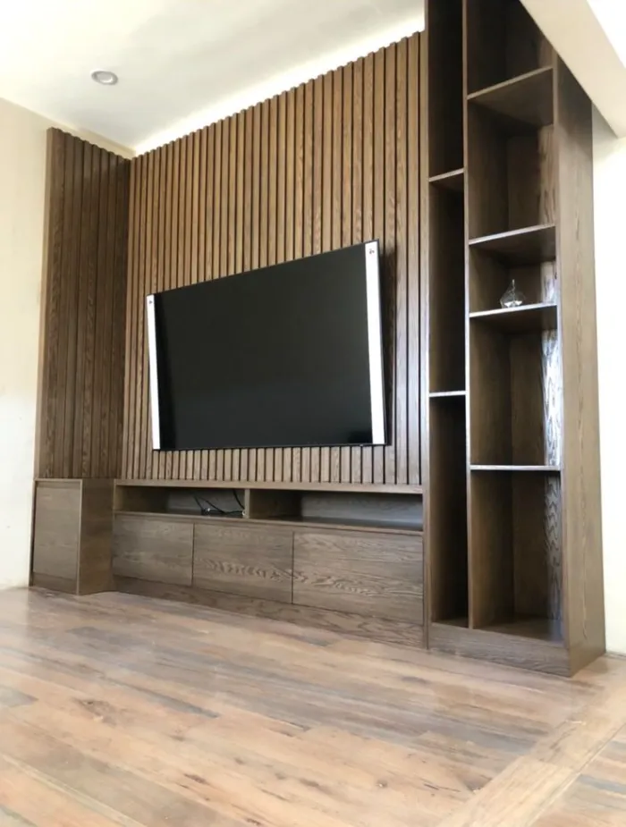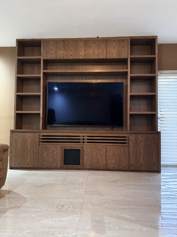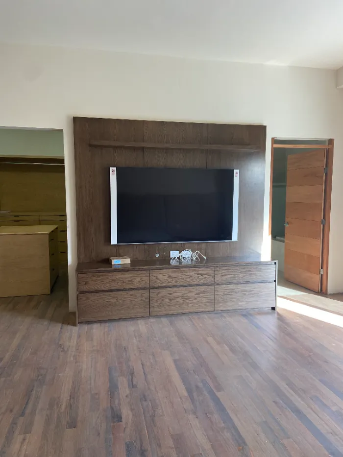 Resolvemos retos como columnas estructurales, nichos irregulares, vanos y cambios de nivel, integrando la televisión de manera natural dentro del conjunto. En proyectos específicos, combinamos el mueble de TV con chimeneas decorativas, creando composiciones híbridas de fuego y entretenimiento que elevan la experiencia del espacio sin perder funcionalidad.