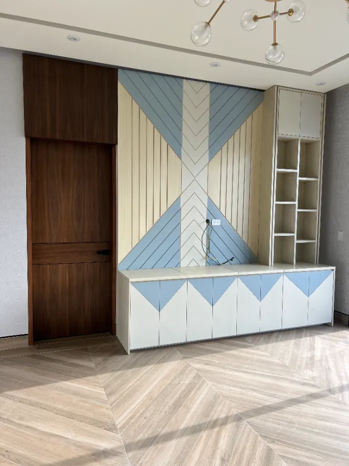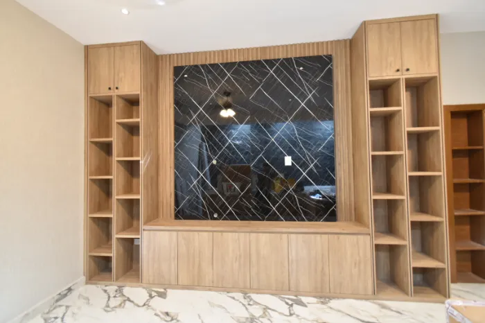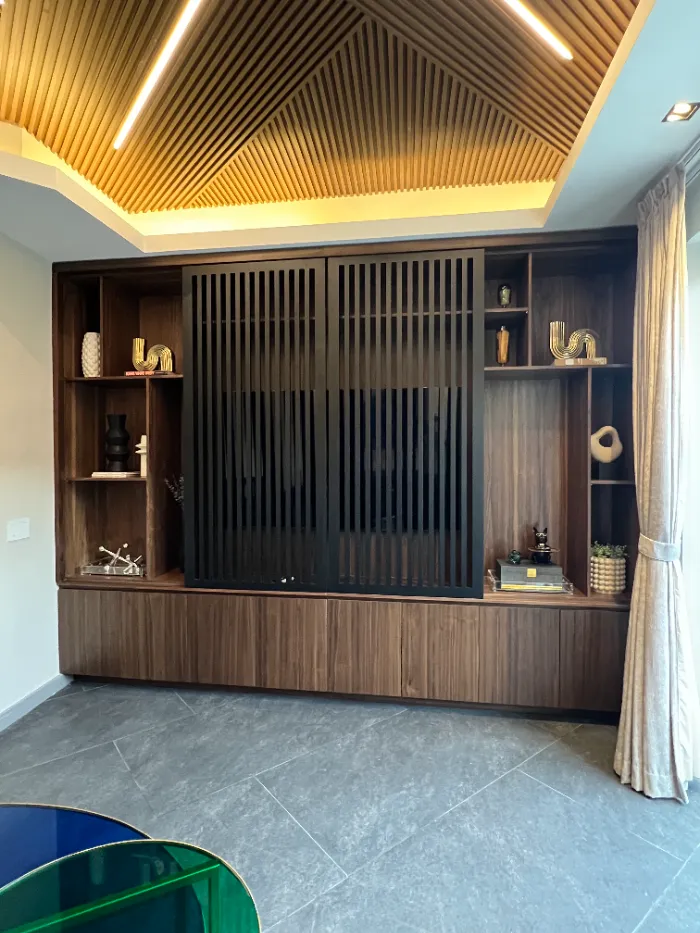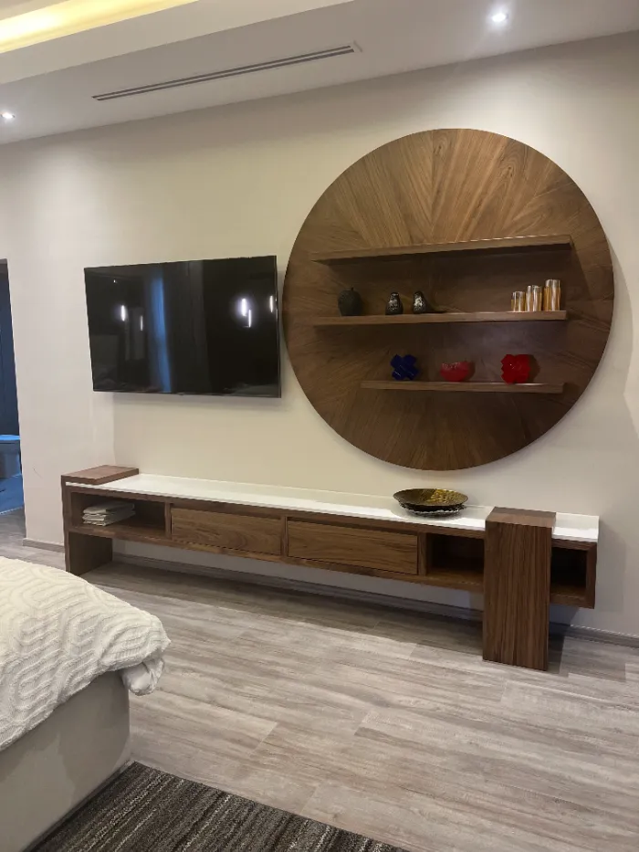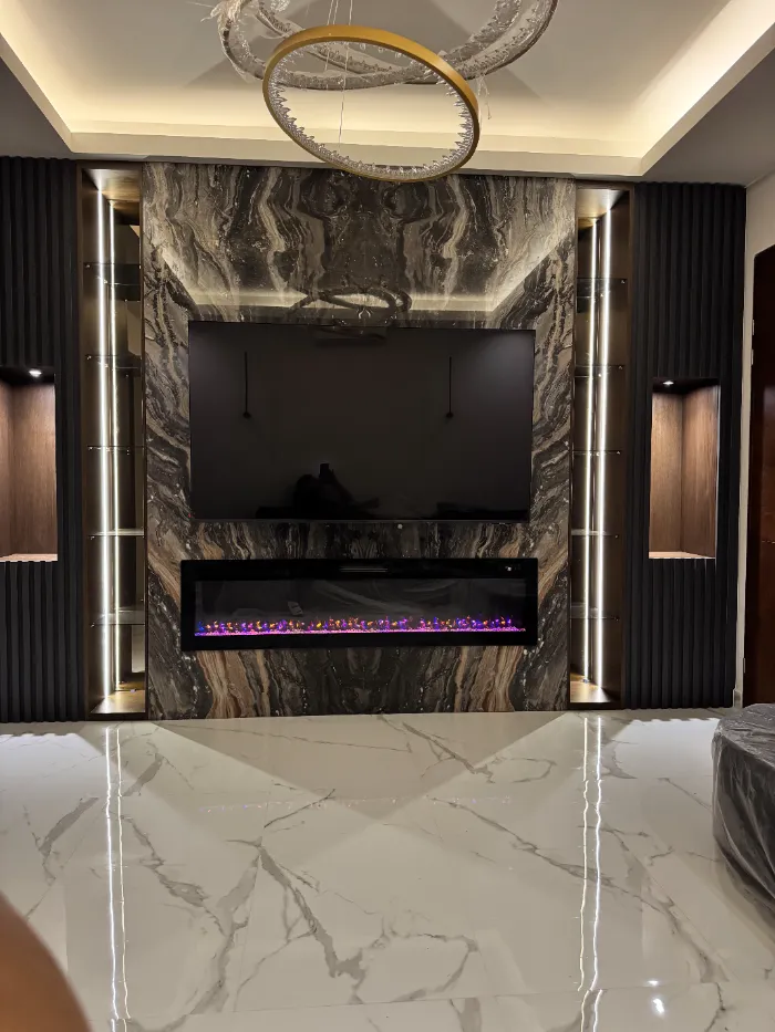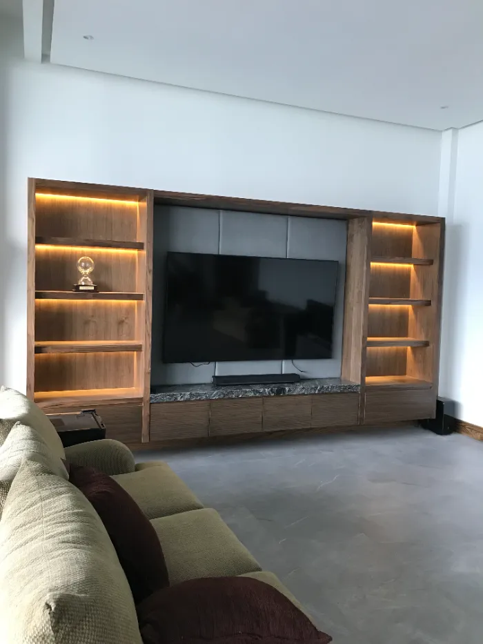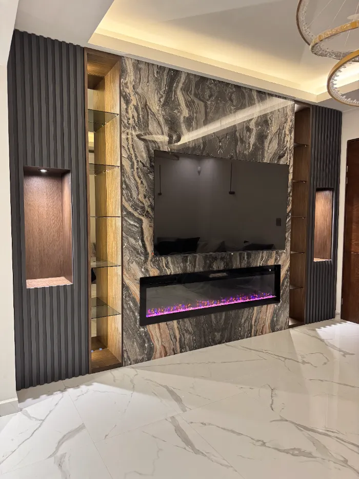 Resolvemos retos como columnas estructurales, nichos irregulares, vanos y cambios de nivel, integrando la televisión de manera natural dentro del conjunto. En proyectos específicos, combinamos el mueble de TV con chimeneas decorativas, creando composiciones híbridas de fuego y entretenimiento que elevan la experiencia del espacio sin perder funcionalidad.