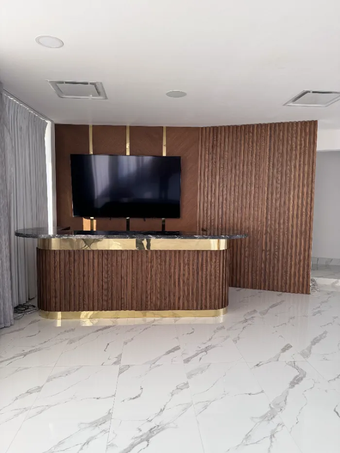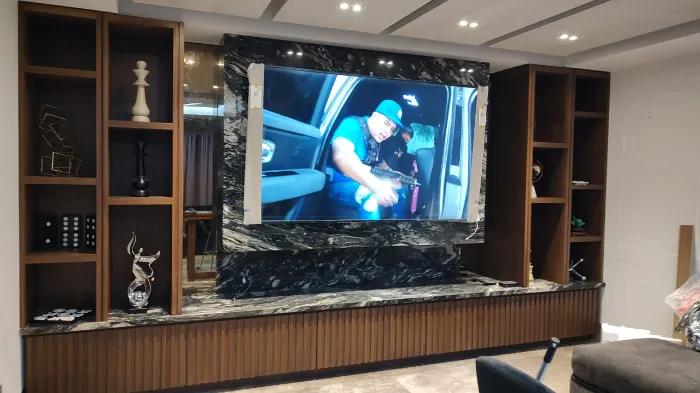La instalación es una parte clave del resultado final. Nuestros equipos se encargan de que cada mueble quede perfectamente alineado, nivelado y anclado, con soluciones estructurales seguras para soportar el peso de pantallas, piedras y materiales de gran formato. La gestión inicial del cableado se realiza desde la instalación para que el sistema quede listo para usarse, sin improvisaciones posteriores.