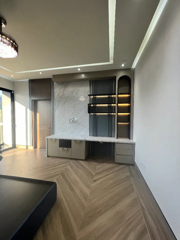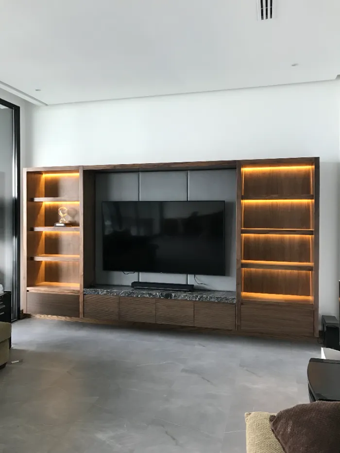 La iluminación LED se integra de forma estratégica, siguiendo los mismos criterios utilizados en vestidores y áreas arquitectónicas: luz indirecta para generar profundidad, luz puntual para resaltar volúmenes y elementos, y una temperatura adecuada para acompañar el ambiente sin competir con la pantalla.